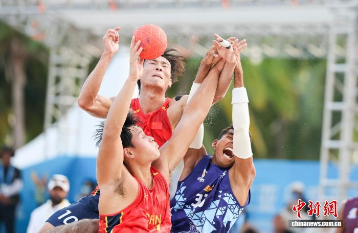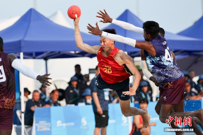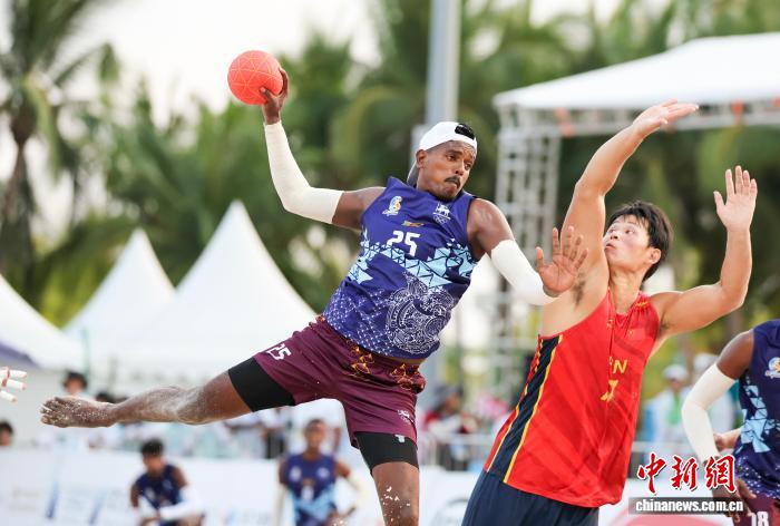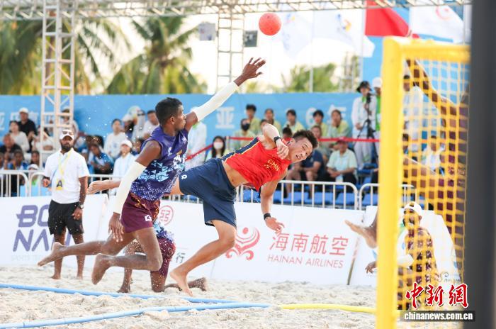 4月21日,海北3亚,第6届亚洲沙岸疏通会迎去尾个角逐日。正在沙岸脚球须眉组小组赛中,华夏队2比0打败斯里兰卡队。图为中原队防卫斯里兰卡队入攻。中新社记者 贾天怯 摄